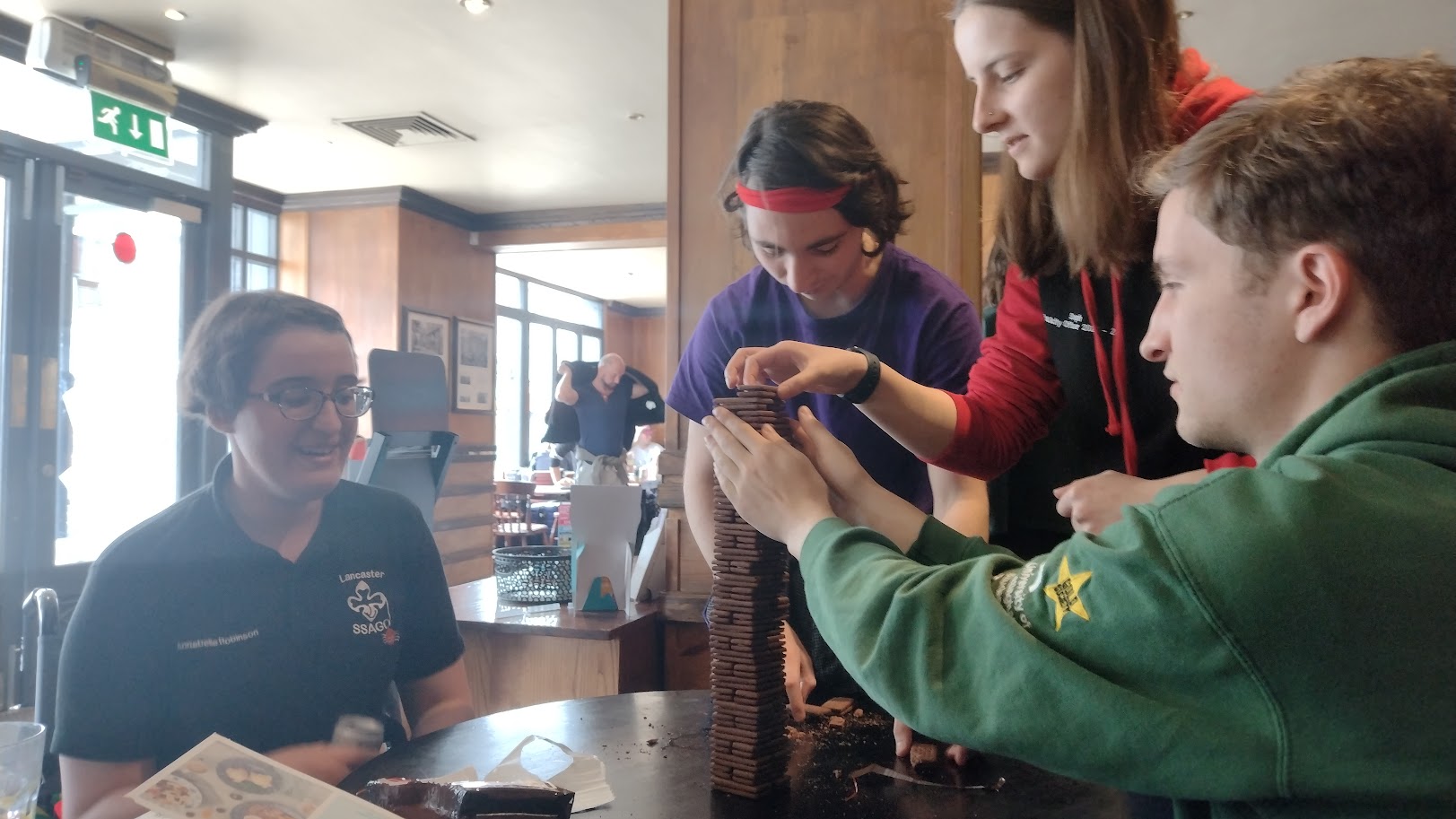 The Biscuit Tower challenge took place at The Ritz Wetherspoons in Lincoln on the morning after MedieBall. Each club was given 3 packets of bourbons and 5 minutes to create the tallest tower possible. It was fairly even until Newcastle knocked their table with 10 seconds left resulting in their tower collapsing.
